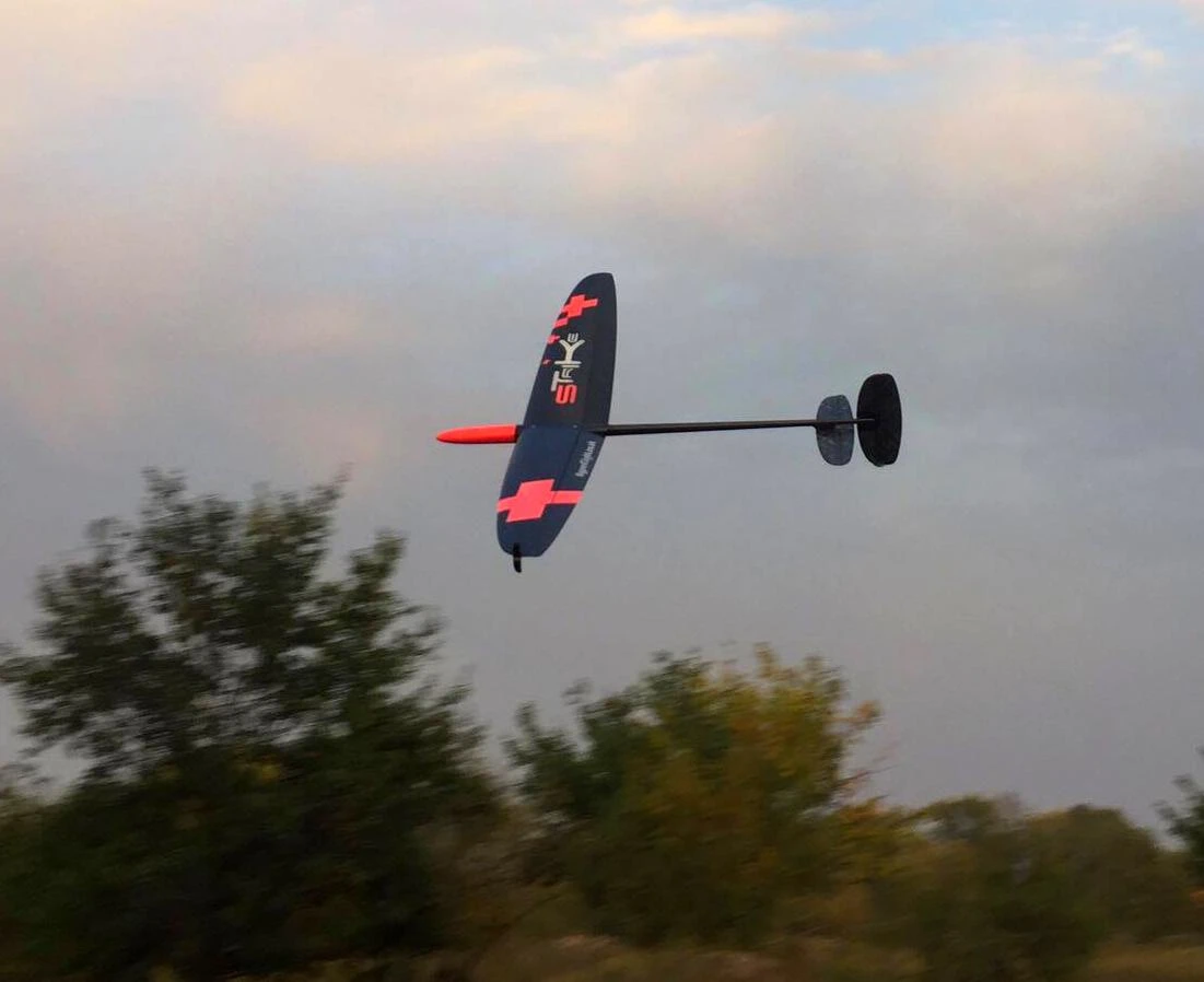The Strike 3 is superbly made using 30 g/m2 Carboline spread carbon, the model is exceptionally light, while also being strong and very rigid, allowing high launches. Still air times of 2 minutes have been reported by strong launchers, and pilots enjoy the excellent performance and sweet handling. Its full span ailerons allow camber adjustment in flight, giving it a wide speed range, allowing it to be flown in moderate winds, which is unusual for 1m gliders.